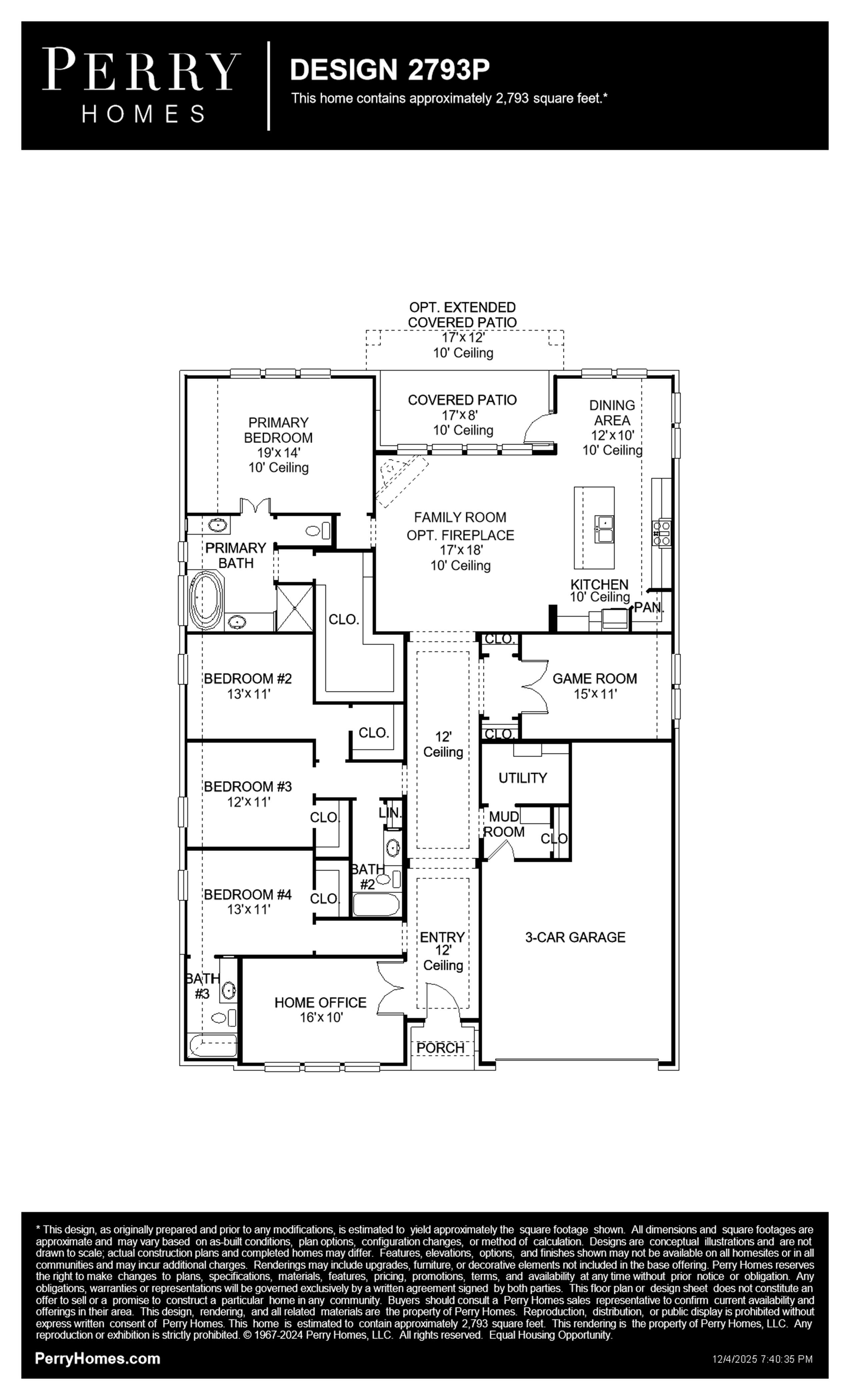 Welcoming front porch leads into extended entry with 12-foot ceilings. Home office and game room with French doors frame the entry. Guest suite features a full bathroom and walk-in closet. Dining area opens up to the family room with a wall of windows. Island kitchen features built-in seating and a corner pantry. Private primary suite with three large windows. French doors open to primary suite that includes dual vanities, a garden tub, separate enclosed shower, and generous walk-in closet. Secondary bedrooms feature a walk-in closet and full bathroom with a linen closet. Covered backyard patio. Mud room and utility room just off three-car garage. Representative Images. Features and specifications may vary by community.