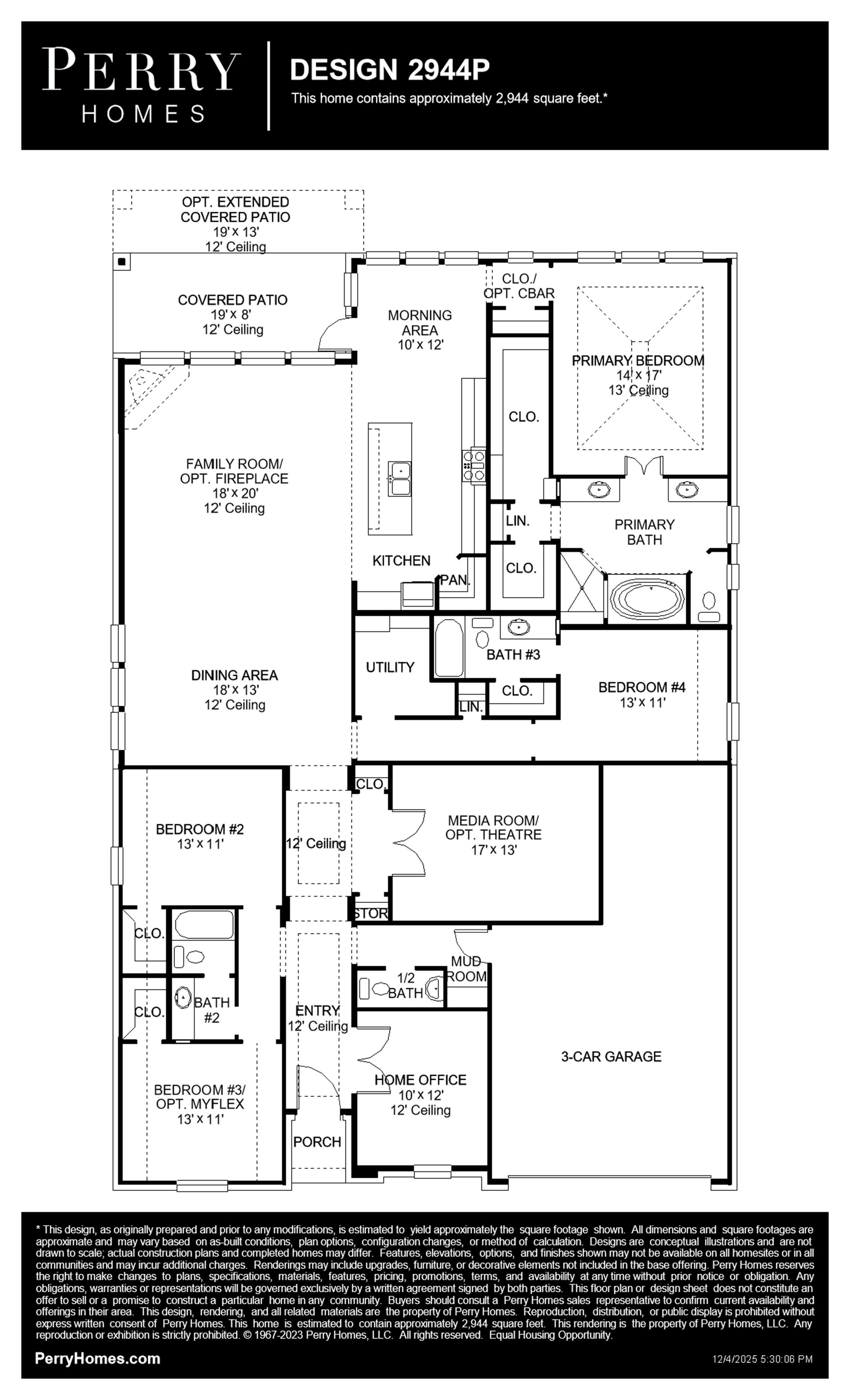 Home office with French doors set entry. Media room with French doors off extended entry. Formal dining room flows into open family room with wall of windows. Kitchen features corner walk-in pantry and generous island with built-in seating space. Adjoining morning area features wall of windows. Primary suite includes double-door entry to primary bath with dual vanities, garden tub, separate glass-shower and two walk-in closets. Guest suite offers private bath. High ceilings and abundant closet space add to this spacious four-bedroom design. Covered backyard patio. Mud room off three-car garage. Representative Images. Features and specifications may vary by community.