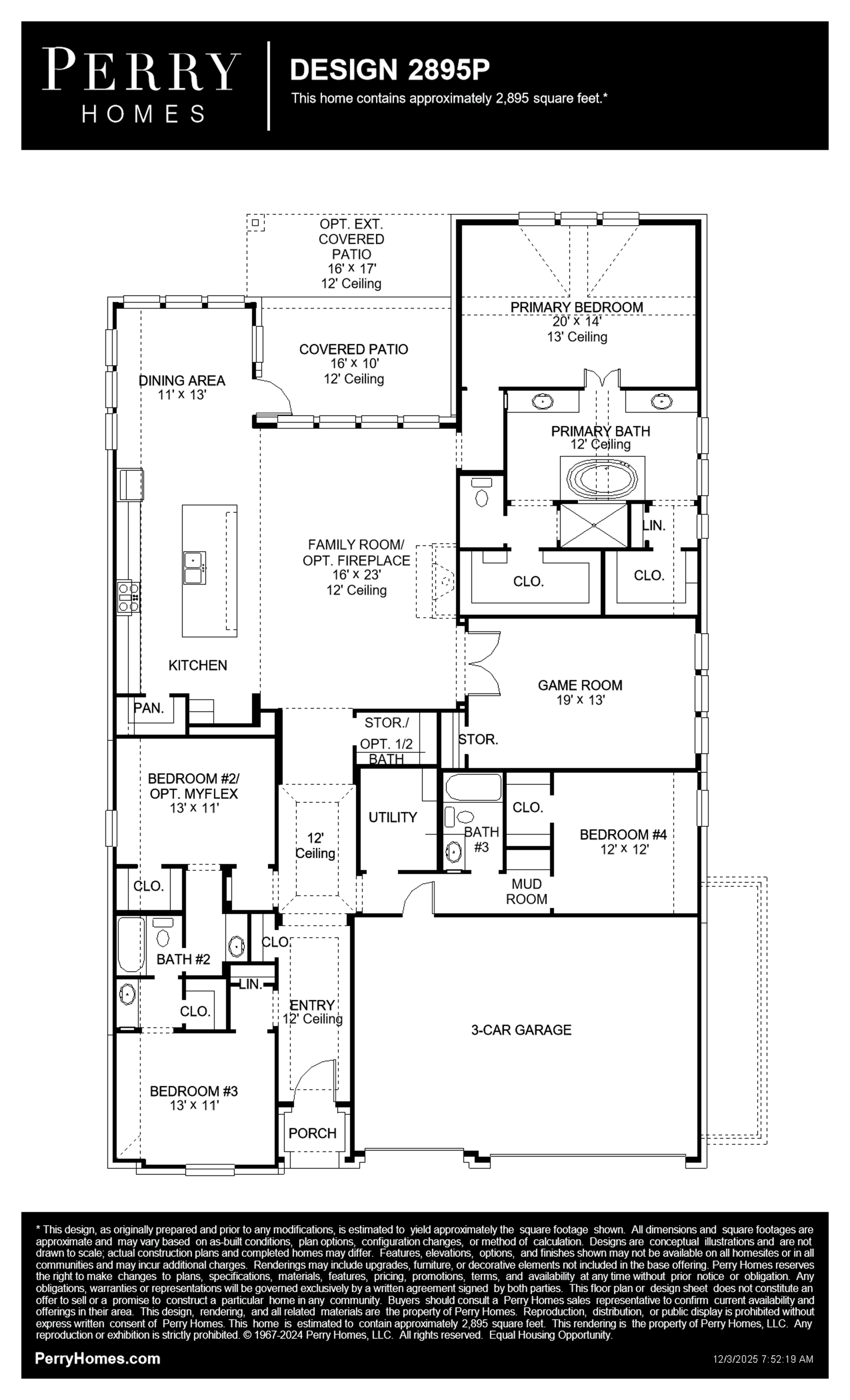 Extended entry leads to open family room, kitchen and dining area. Family room features wall of windows and a wood mantel fireplace. Kitchen hosts island with built-in seating space and a 5-burner gas cooktop. Game room with French doors just off family room. Secluded primary suite. Dual vanities, a freestanding tub, separate glass-enclosed shower and two large walk-in closets in primary bath. A Hollywood bath, high ceilings, large windows and abundant closet space add to this one-story design. Extended covered backyard patio. Mud room off three-car garage. Representative Images. Features and specifications may vary by community.
